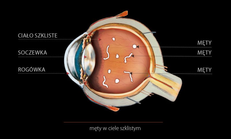 szklistego, które powodują widoczne „muszki” lub „nitki” w polu widzenia.
